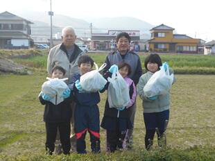 高齢者大学のみなさんとしめ縄飾りを作りました。 わらを50本数え、束にしました。それを3つ作りました。 その後、一つにして、霧吹きで湿らせながらたたいて柔らかくしました。 右にねじりながら、左巻きに3つあみをして形ができました。 その後、飾りをつけました。 家族を守るしめ縄です。来年もよい一年になると思います。 ありがとうございました。