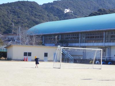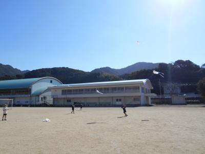 1,2年生は、生活科でつくった凧を上げて元気に遊んでいます。