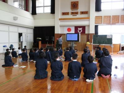 1月24日の学校給食記念日に先がけ、栄養教諭の先生から給食についてのお話をしていただきました。