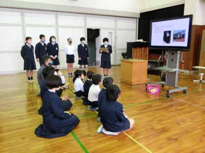 12日(金)の児童集会、6年生が総合的な学習の時間に調べたことを発表。プレゼンテーションソフトを使い、ポイントを絞った発表に下級生も興味津々。