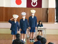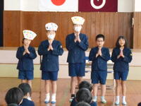 都呂々小の4人は、国語で学んだ「やくそく」の音読劇を披露。皆、ナレーションとあおむしの役などの声を使い分けするなどし、とても上手に音読で表現していました。お話の様子がより伝わるように、ジェスチャーも工夫してあり、エンターテイメント性の高い仕上がりでしたよ。その後、「ジングルベル」の曲を、それぞれ鈴を鳴らしながら歌った子供たち。堂々とした姿、素敵でした。