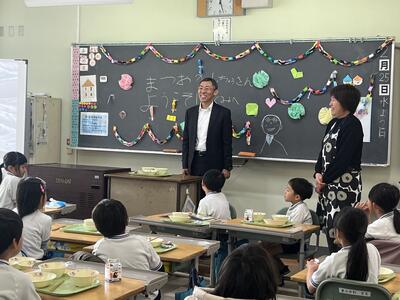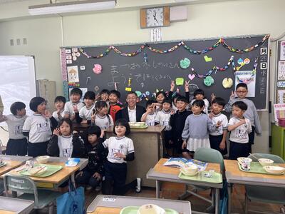 2月25日(水)、松岡市長を迎えてのスクールランチが行われてました。今回は、1年生と一緒の給食です。教室一杯の子供たちと、元気一杯、笑顔一杯の子供たちの様子に、市長は圧倒されると同時に、1年生の規律ある姿に大変感心されておられました。