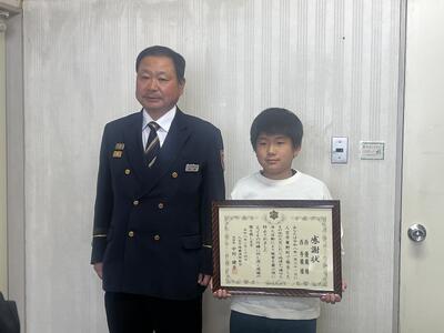 2月24日(火)、5年生の西君が農地火災発生時、近隣の皆さんの協力し初期消火活動を行ったとして、下球磨消防所長より、感謝状贈呈がありました。