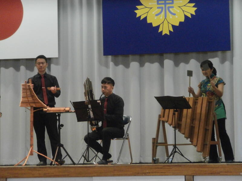10月28日(月)に、台湾からバンブーオーケストラの皆さんに来校いただき、演奏会が実施されました。演奏会では、竹で作られている楽器を使って演奏されました。また、楽器の紹介等もあり、めずらしい楽器の音に興味津々で聞き入っていました。日本の曲が流れると、リズムを取りながら楽しそうに鑑賞していました。