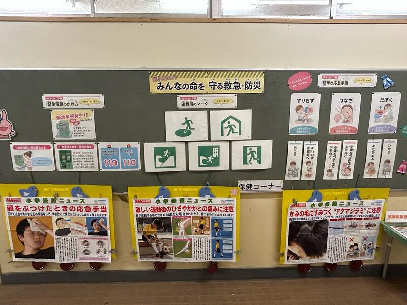 保健室前の掲示物が変わりました。今回のテーマは、「みんなの命を守る救急・防災」です。