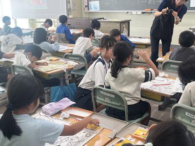 6年生では、現在、平和学習を行っています。インターネットや本を用いて調べ学習を進めていますが、更に詳しく調べるために、10月8日(火)の総合的な学習の授業では、錦町の海軍航空基地「ひみつ基地ミュージアム」の副館長の平本様にお越しいただき、太平洋戦争時の人吉の様子について出前授業をしていただきました。