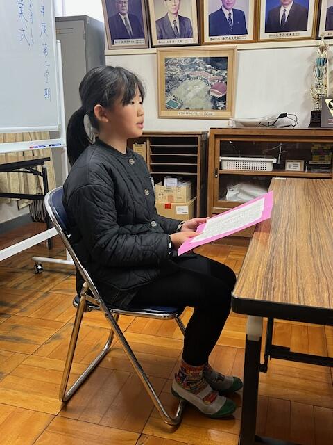 また、学年代表の子供たちが2学期の振り返りをしれくました。1年生は福山さん、3年生は値賀さん、5年生が高場さんです。3人ともに素晴らしい発表をしてくれました。