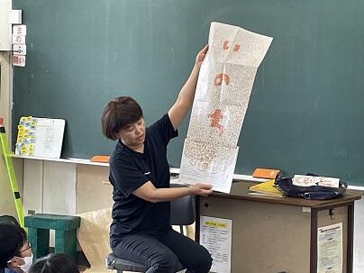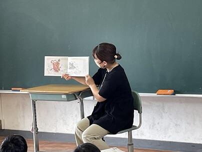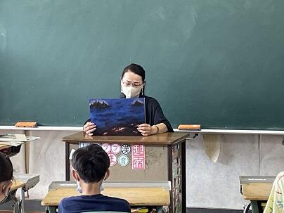 教室に大きなパネルボードが入ってくると、子ども達も興味津々の様子で、小さな歓声を上げてくれました。読み手がパネルを出す側と分かれて、3人で“たなばた”の物語を披露していただき、最後にはみんなで七夕の歌もうたいました。