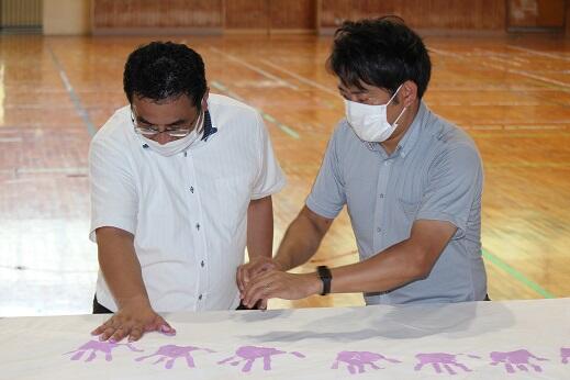 本日、プールの外壁に東間小学校150周年記念の看板を設置し、学校に記念品としてテントを2張(白·紺)納品しました。