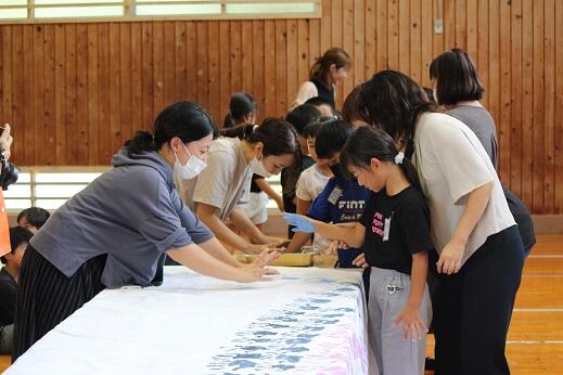 8月2日(水)に夏休み学習教室の一環としてお菓子作り体験をしました。12家族35名が参加し、学校支援ボランティアの3名、家庭教育委員の2名、食生活改善委員(すみれの会)の6名のボランティアの皆様のご協力のもと『いきなり団子』を作りました。