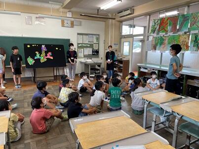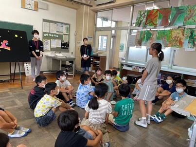 教室に大きなパネルボードが入ってくると、子ども達も興味津々の様子で、小さな歓声を上げてくれました。読み手がパネルを出す側と分かれて、3人で“たなばた”の物語を披露していただき、最後にはみんなで七夕の歌もうたいました。