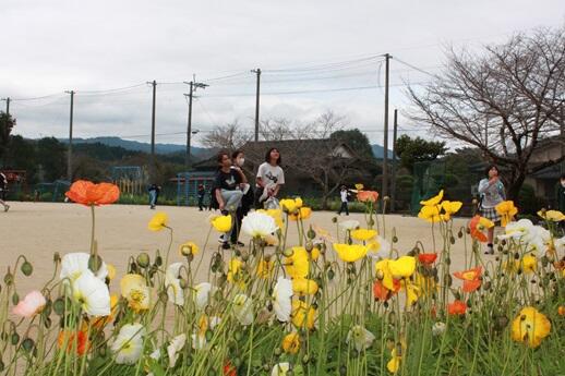 卒業する6年生のためにたくさんの花を育ててきました。フラワーロードの中を卒業していってほしいと願いを込めて。