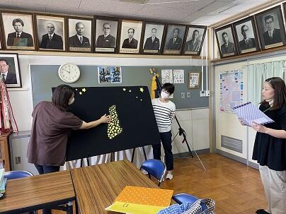 教室に大きなパネルボードが入ってくると、子ども達も興味津々の様子で、小さな歓声を上げてくれました。読み手がパネルを出す側と分かれて、3人で“たなばた”の物語を披露していただき、最後にはみんなで七夕の歌もうたいました。