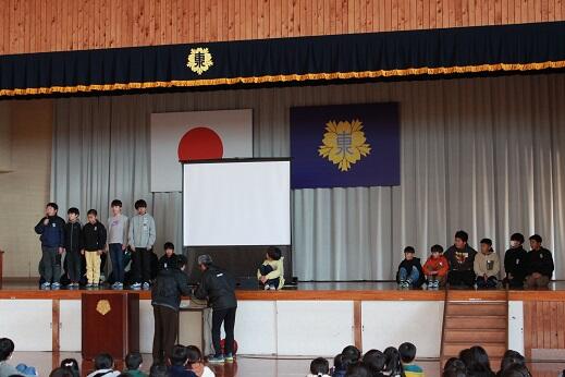 1月26日(金)、朝の全校集会で給食委員会の発表がありました。委員会の子供たちで工夫したクイズ等を行いました。