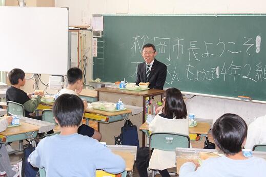 1回目は6年生がお昼をご一緒させていただきましたが、今回は4年生が給食をともにいただきました。市長の随行としてこられた石本さんも急遽、子供たちと一緒に持ってこられたお弁当を食べられることになりました。