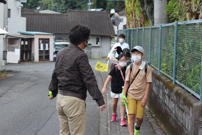 今日のPTAあいさつ運動+中津留様+子供たちの朝のボランティア