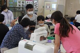 今日は、5年1組の子供たちがはじめてのミシン操作に挑みました。