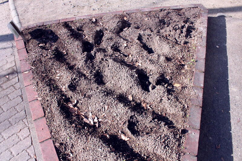 ただ、きれいに畝を作っていよいよ植え替えをしようと思ったときに、悲しい出来事もありました。意図的に花壇を踏まれるという出来事。大きな足跡です.土日に起こった出来事です。きっと、私たちの密かな思いに気づけなかったのでしょう。苗が植えてあることを見えていても、それが苗であることに気づけなかったのでしょう。「気づく」という感性を大切にしたいものです。