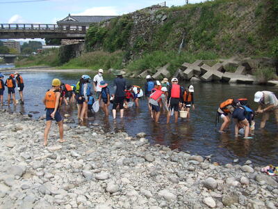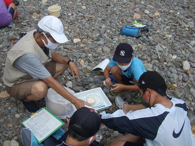指導員の先生方に水質や石の形、川をめぐる環境のことを説明していただいた後、実際に川に入って水生生物を採集し、それらの生物の分類作業を行いました。今回の体験を通して、環境に関する意識の高まりにつながったことと思います。
