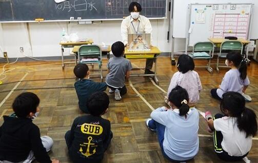 校内読書旬間が10月11日~22日でした。写真は、さくら学級で、紙芝居を見ているところです。「へっぴり女房」と言う話です。子ども達は、この紙芝居を見て「おならで、なしの実が落ちて、おもしろかった。」「女房のおならがすごく大きくてびっくりしました。」と言っていました。先生達は笑って吹き出していました。