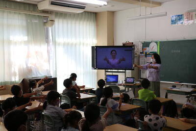10/6(水)の朝の活動「東間タイム」は全校集会でした。これまでは校内放送で音声のみでしたが、各教室の電子黒板でZoomを利用できるようになったのを機に、今回の全校集会から各教室で電子黒板を見ながら集会に参加するという形になりました。