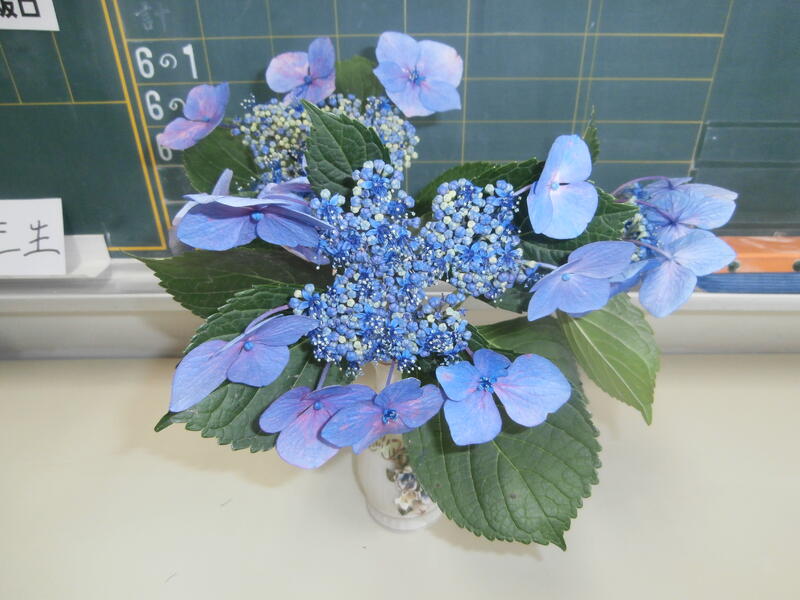 学校の玄関には、本校の尾方先生が生けられた「生け花」が飾られています。本校に来校される皆さんからは「素敵ですね。」そして、「生け花が飾られているなんて、素敵な学校ですね。」と言われます。うれしい限りです。(先生方に感謝です。)また、職員室にも子供たちが「ガクアジサイ」を飾ってくれました。