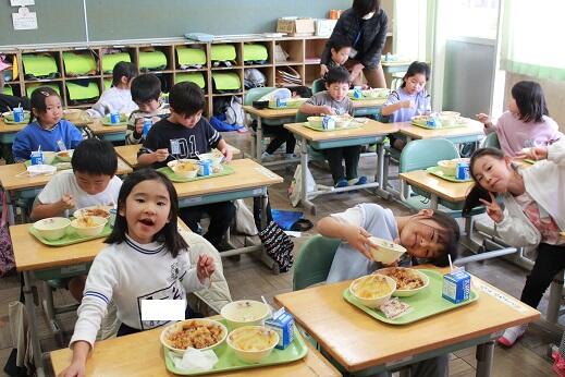 東間小学校における最後の給食は3月18日(月)のハヤシライス等でした。大人気のメニューです。
