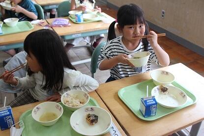 さあ、今日の給食の様子をお知らせします。「いわしの梅煮」は子供たちにとってどうかなあと思っていましたが、教室を訪れるとおかわりする子供たちもいっぱいいました。栄養満点の給食です。
