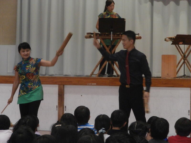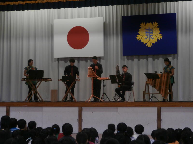 10月28日(月)に、台湾からバンブーオーケストラの皆さんに来校いただき、演奏会が実施されました。演奏会では、竹で作られている楽器を使って演奏されました。また、楽器の紹介等もあり、めずらしい楽器の音に興味津々で聞き入っていました。日本の曲が流れると、リズムを取りながら楽しそうに鑑賞していました。