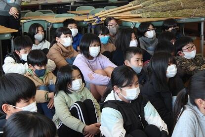 中津留様より6年生がほうきを受け取り、6年生が5年生にほうきをわたすという時間をつくりました。大柿長幸様が込めていただいた心を中津留様より6年生に渡していただき、6年生が伝統をバトンとして引き継ぐための時間です。6年生からのメッセージ、5年生からの決意の言葉が聞かれたところです。