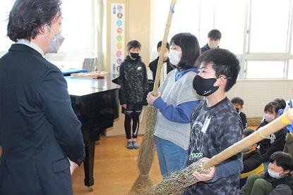2月15日、中津留物産(社長:中津留敏之)様から30本のほうきの寄贈をいただき、5・6年生による贈呈式を行いました。