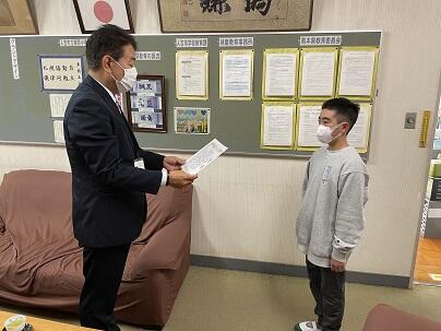 本日、人吉税務署の署長、宮原雅史 様、総務係長 緒方 裕貴 様が来校いただき、税に関する習字の表彰を行っていただきました。