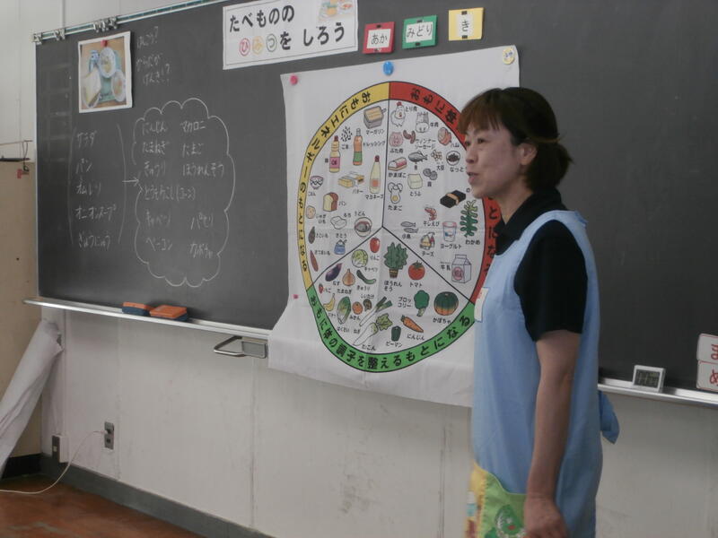 9月27日(金)、1年生の食育の授業がありました。給食センターの瓜生栄養教諭においでいただき、「たべもののひみつをしろう」のめあてのもと学習を進めました。子供たちは、「あか・き・みどり」の食材とその役割について学びました。