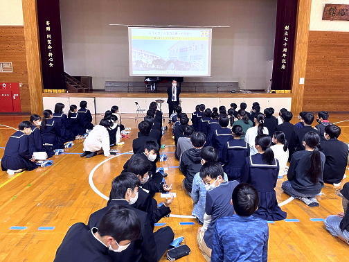 全校集会(オンライン)で西日本読書感想画コンクール及び科学展の表彰を行いました。