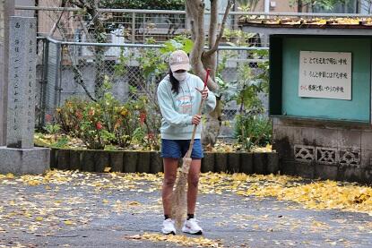 毎日毎日、落ち葉が落ちてきて高学年の皆さんが朝の活動として頑張ってくれています。特にやっかいなのが銀杏の葉っぱです。