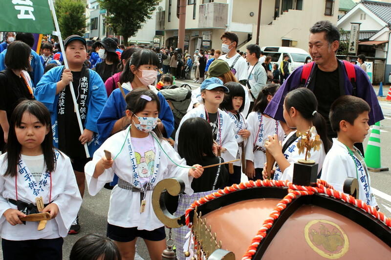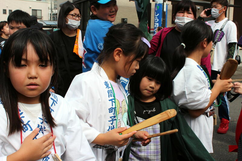 本日、10月9日、人吉球磨の伝統文化であるおくんち祭りに東間小学校区から4つの子供神輿が参加しました。はっぴを着た子供たちの元気なかけ声、暑さの中疲れた表情、応援する保護者、地域のみなさんの様々な姿が見られました。沿道にもたくさんの観覧者が集まっていました。