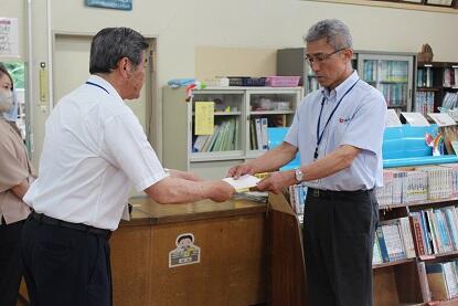家庭教育部長の髙橋さんも、1学期間、ほぼ毎日、校門に立ってあいさつ運動をしていただきました。終業式の前日、中津留さんが髙橋さんに6年間使った登校旗を渡しに来てくださいました。ちょっと重すぎますが。でも、自分にできることを少しずつやっていただく見守り、とても感謝しています。