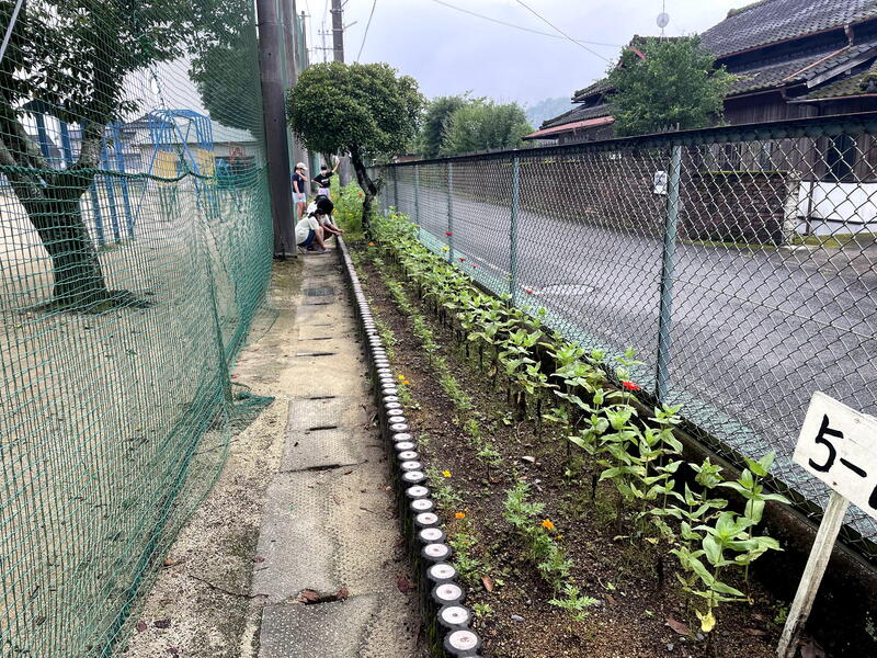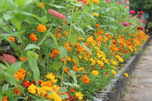 梅雨の中、たくさんの花が咲いていますが、それ以上に雑草も多い茂るようになりました。草との戦いです。運動場外の道沿いにはたくさんの百日草が花を咲かせていますが、内側から見ると、キバナコスモスがきれいに咲いているのです。