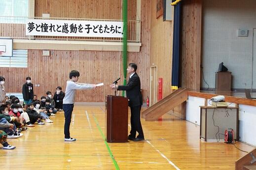 また、人吉球磨書写展の表彰を行いました。代表として6年生の 青木 さんに賞状をお渡ししました。