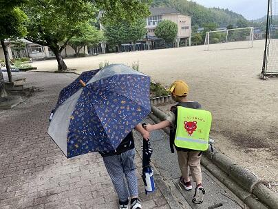 雨の中、1年生の手を握り、自分の傘で1年生を覆い隠すように登校してきた4年生。