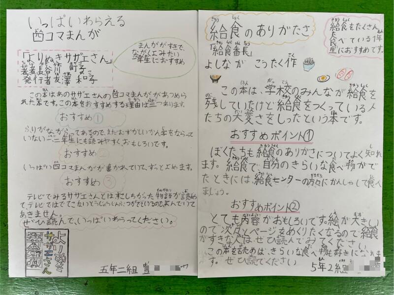 5年生の国語では、推薦文を書く学習があります。そこで、「自分のおすすめの本を下級生に紹介しよう!」ということで、5年生がおすすめの本カードを持ってきてくれました!