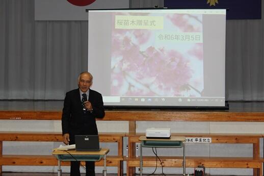 3月5日(火)、人吉球磨退職校長会から本校に桜の苗(陽光桜)2本の寄贈があり、その贈呈式が行われました。本来ならば当日、6年生で植樹を行う予定でしたが、大雨の予想となり、植樹自体は3月4日(月)に退職校長会の皆様と6年生児童代表3名で行ったところです。