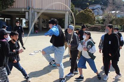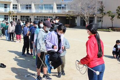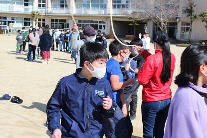 ぴょんぴょんタイムでは、各学級互いに協力しながら縄跳びをする姿が印象的でした。得意な子どもも苦手な子どももいる中で、失敗しても温かい声を掛け合う姿が随所に見られ、充実した時間を過ごしました。