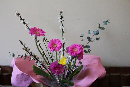 今週も田代教諭が、学校の花を生けてくれました。梅の花を上手に使った趣のある一華です。