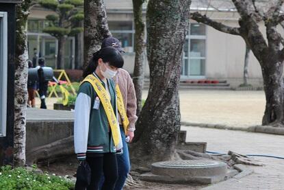 また、学校支援ボランティアの皆様、そして6年間、交通指導に立っていただいた中津留様も朝のあいさつ運動に取り組んでいただいています。