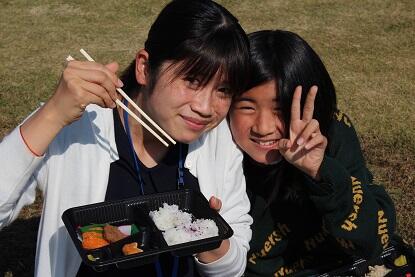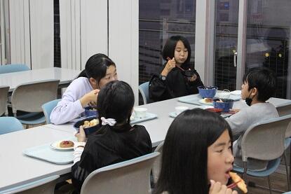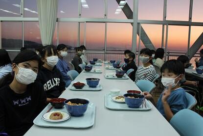 一生懸命に活動した後の夕食、どんなメニューなんでしょうね!子供たちがおいしそうに頬張る夕食の様子です。子供たちの背景が夕焼けに染まっています。