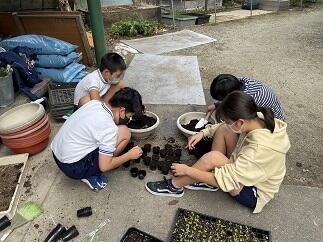 2年生と3年生が毎日のように、花の種まきや植え替えにやってきてくれます。