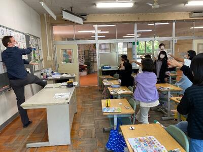 ALTのコーディー先生と一緒にアルファベットの形を体で表現して遊びました。子供たちは「A!B!C!・・・」と楽しそうに歌いながらジェスチャーをしていました。初めは音楽と一緒に歌っていましたが、学習が進むにつれて、「せーのっ!」と一声かけるとアルファベットソングを自分たちだけで歌えるようになりました。