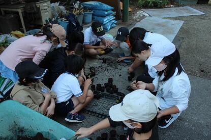2年生と3年生が毎日のように、花の種まきや植え替えにやってきてくれます。