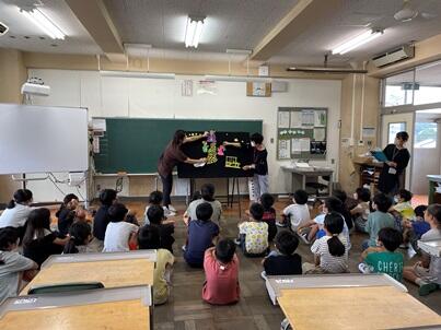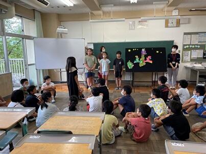 教室に大きなパネルボードが入ってくると、子ども達も興味津々の様子で、小さな歓声を上げてくれました。読み手がパネルを出す側と分かれて、3人で“たなばた”の物語を披露していただき、最後にはみんなで七夕の歌もうたいました。